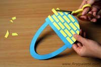 3. Pega las tiritas en el cesto en fila. No te preocupes en pasarte de los bordes, puedes decorar los dos lados del cesto si quieres.