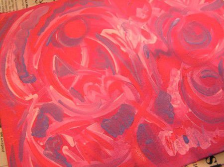 1. Pinta el lienzo de un color cualquiera que elijas, ésta será la base y luego mientras está todavía húmedo, deja que tu hijo haga la pintura con un tono más claro del mismo color (es decir, rosa oscuro y rosa claro)