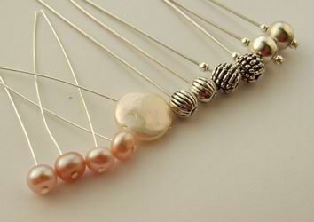 4. Desliza las cuentas pequeños en los alfileres para cabellos. Usa algunas de las cuentas espaciadoras pequeñas si los agujeros son demasiado grandes como para sostenerlas dentro del alfiler.