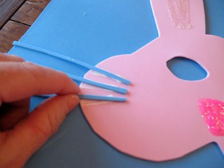 8. Cortar la otra goma eva, unos 10 x 2,5 cm para hacer 6 tiras. Pega tres patillas en cada mejilla.
