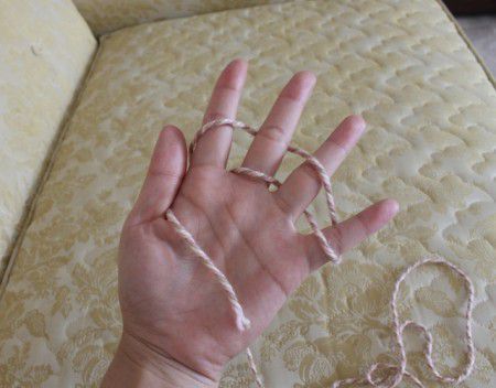 3. Toma la lana y envuelve alrededor de la palma de tu mano yendo de atrás para adelante y deja la lana colgando en la parte posterior de tu mano colocada entre el pulgar y el dedo índice.