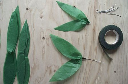 17. Si quieres añadir unas hojas de color verde, corta varias hojas de papel tissue o de crepé verde. Las grandes hojas miden 25 cm de largo y las más pequeñas 20 cm. Aprieta la hoja en el pliegue y de manera segura coloca un trozo de alambre, cubriendo con cinta floral como de costumbre. Coloca las hojas en el aro.!