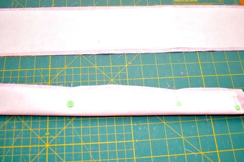 10. Corta 2 piezas de tela de interfaz un poco mas pequeñas que las tiras y planchalas a cada una siguiendo las instrucciones.