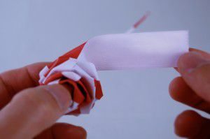 14. Termina de hacer petalos cuando te queden 7/8 cm de tira sobrante..