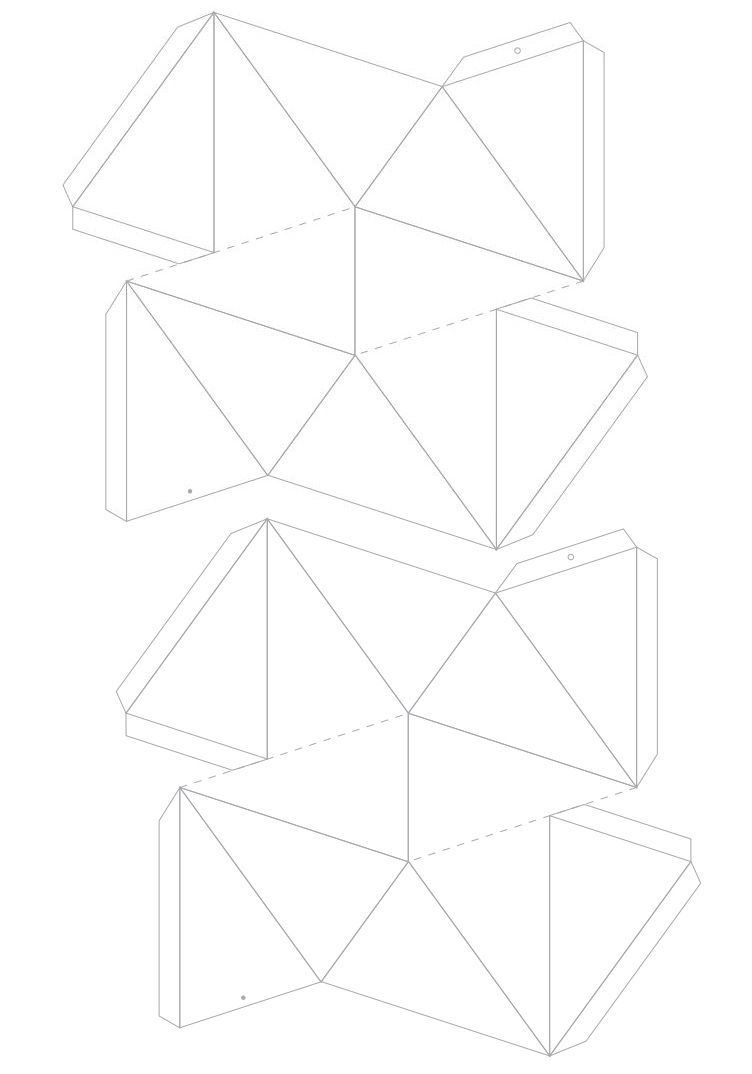 1. Descarga la plantilla e imprímela 3 veces, ya que necesitaras 5 figuras y en la plantilla solo hay 2. Corta cada figura y con una regla y aguja realiza agujeros sobre todas las líneas.