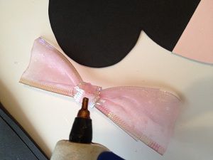 8. Con pegamento caliente coloca el moño sobre una de las orejas de Minnie.