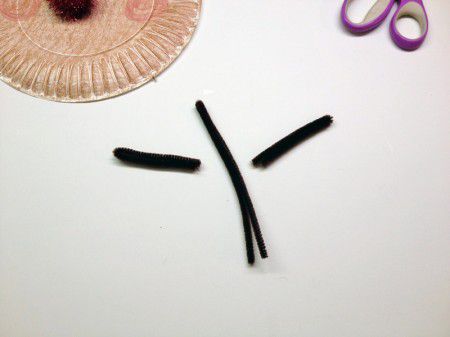 3. Para los cuernos, corta los alambres forrados y pega dos pompones a cada extremo de ellos, pega los alambres a la parte trasera del plato.