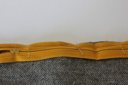 5.Engancha el exceso de tela por fuera del cierre y cose formando una costura prolija y alineada.