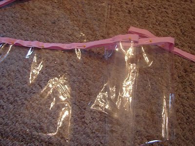 3.Forma tu propia cinta bias con tela rosa y enganchala a la parte superior de cada tira de tela plástica.