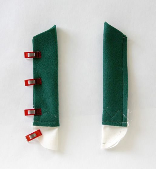 2.Comienza formando la cabeza y sombrero del duende. Coloca las orejas con sus derechos juntos, engancha y cose dejando el borde recto pequeño sin coser. Repite con las otras dos.
